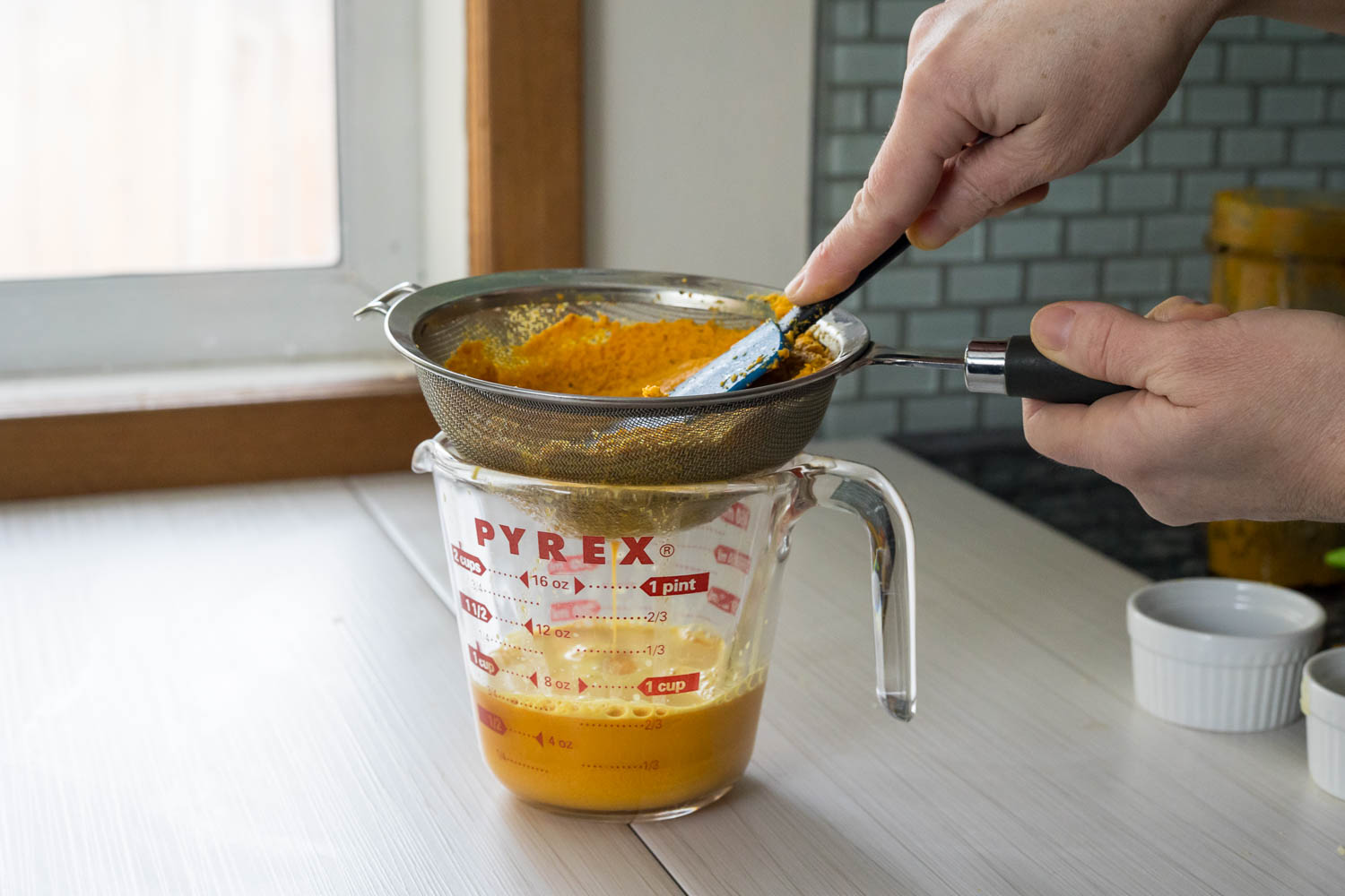 Pour the mixture through a fine mesh strainer or nut milk bag into a bowl or large measuring cup. Press or squeeze to extract as much liquid as possible.